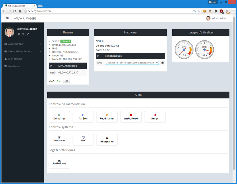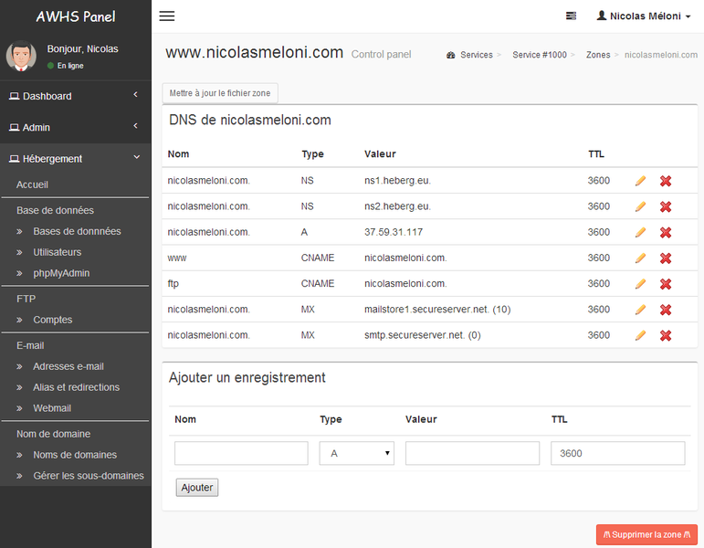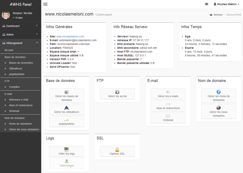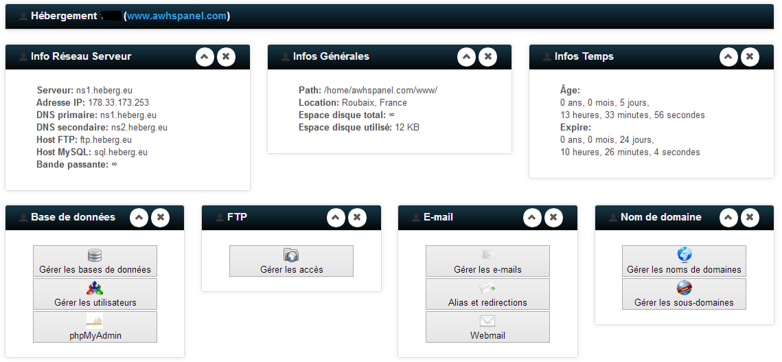 AWHSPanel est site PHP utilisant le framework Symfony2, permettant de gérer des sites (sous-domaines, zones DNS, courriels, redirection de courriels, accès FTP, la création d’une base de données ainsi que l’assignation des utilisateurs à celle-ci), hébergés sur plusieurs serveurs Debian 7.