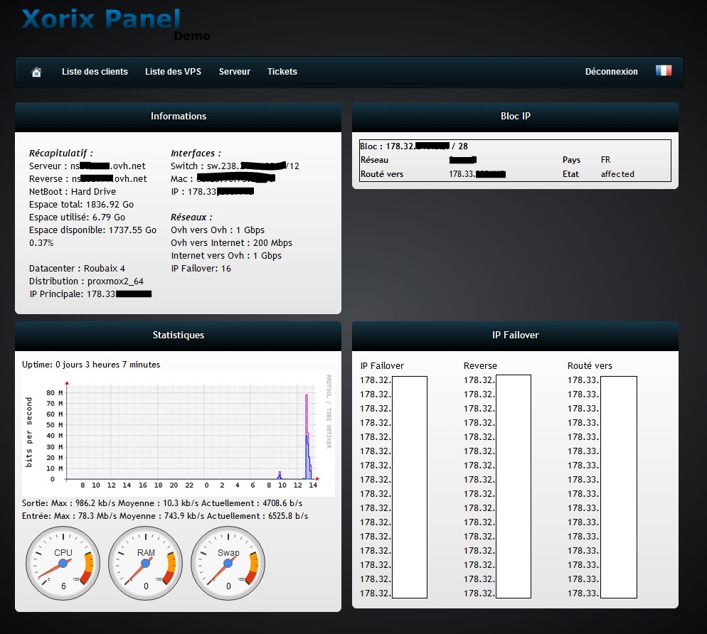 - 2008: Anciennement appelé XorixPanel, un système auto-installable sur des serveurs dédiés seulement compatible chez OVH, permettant d’avoir une boutique pour commander et livrer des VPS (OpenVZ et KVM) automatiquement (installation et configuration).