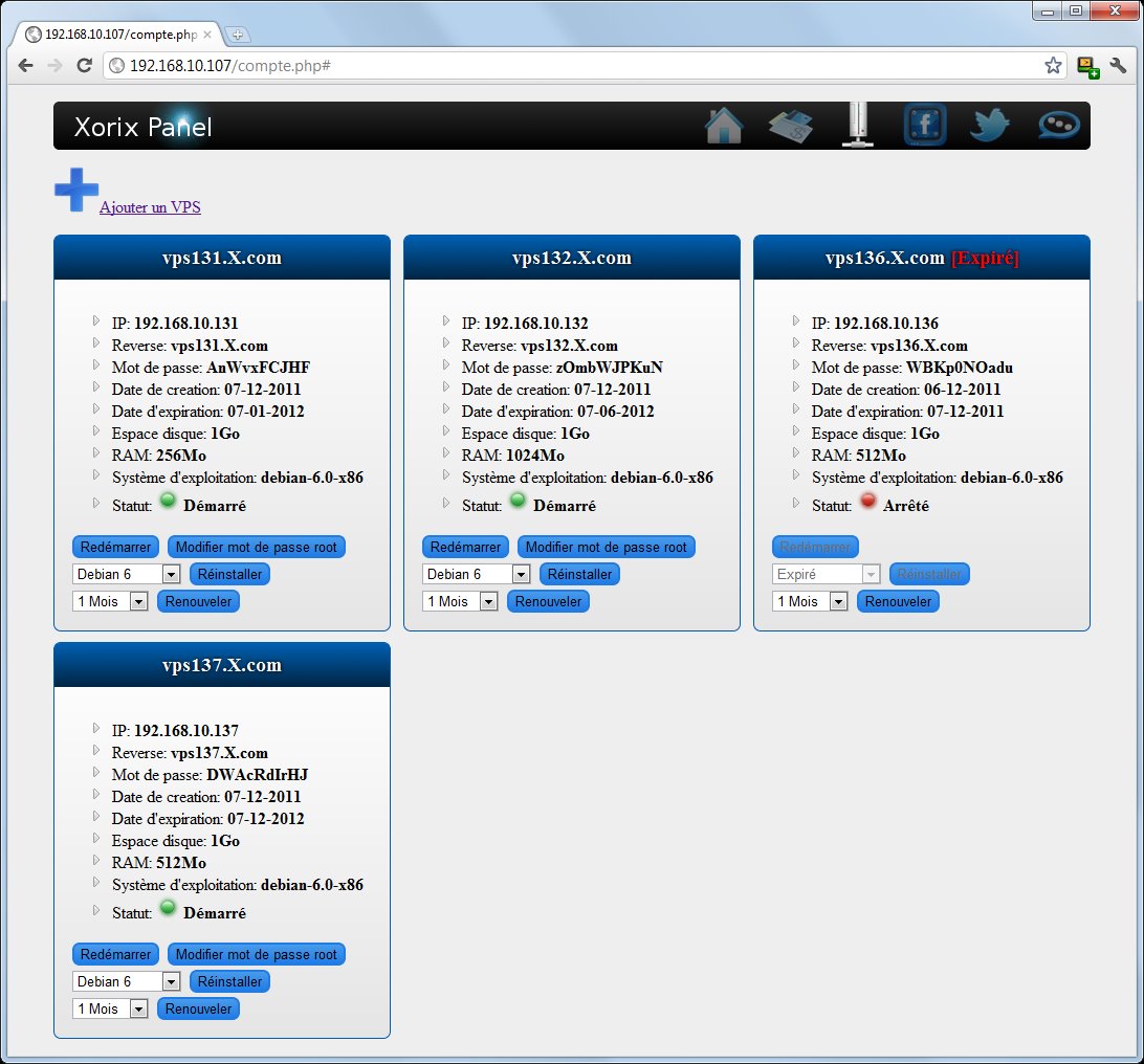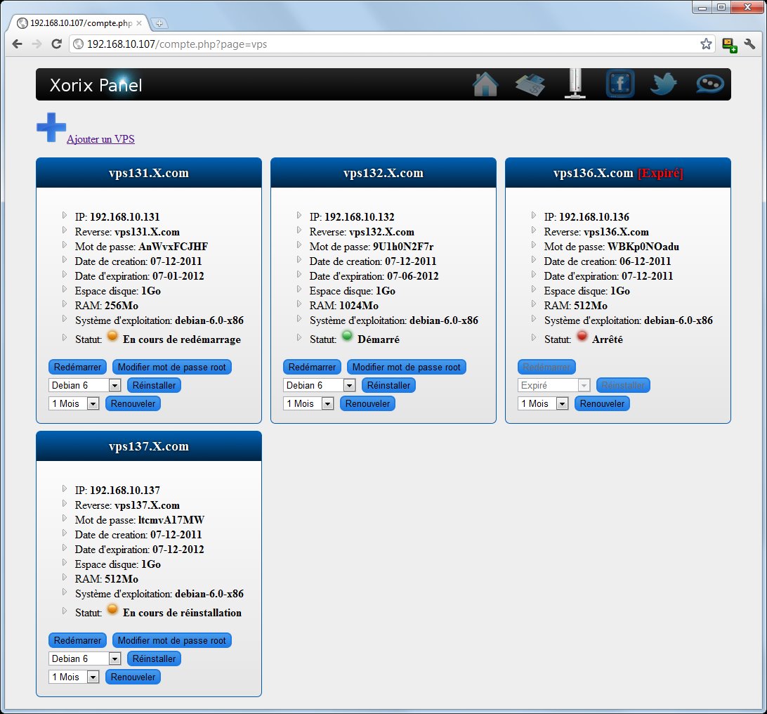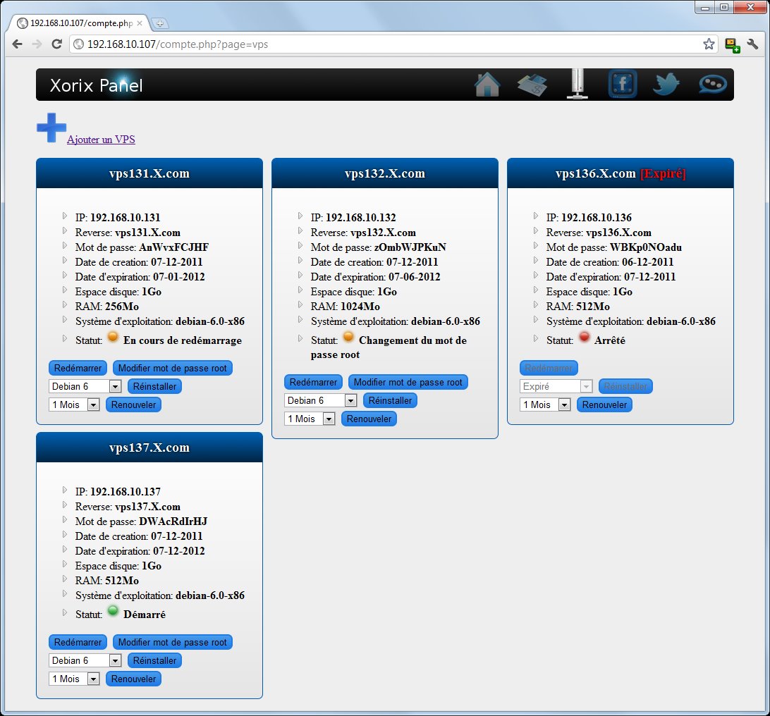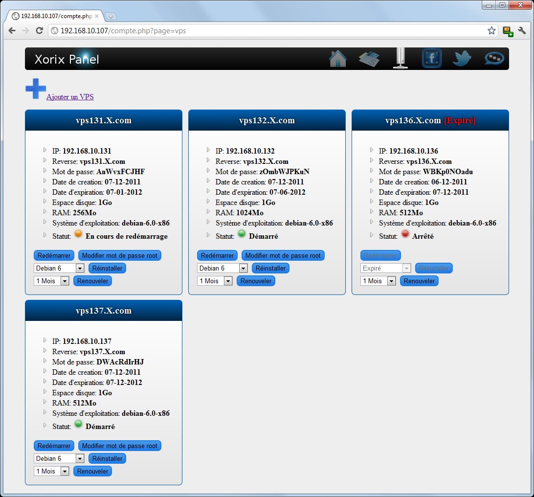 - 2009-2010: XorixPanel est distribué au grand public gratuitement pendant que le développement de AWHSPanel continue à l’interne. Cette ouverture au grand public me permet de pister des éventuels bugs et de fournir un support aux détenteurs du panel en contre-partie d’un VPS pour pouvoir continuer à développer le projet.